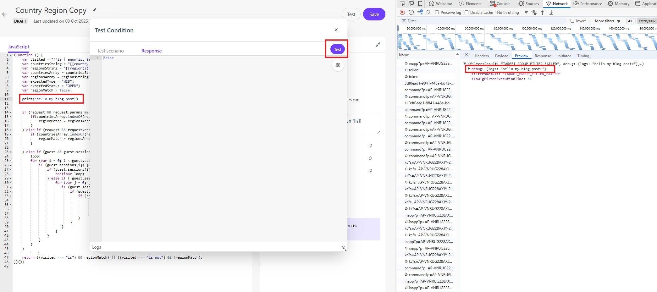 However, debugging conditions in Personalize requires a different approach than simply adding standard logging statements. Remember that console.log isn't supported—you must use the print function instead, as mentioned earlier.