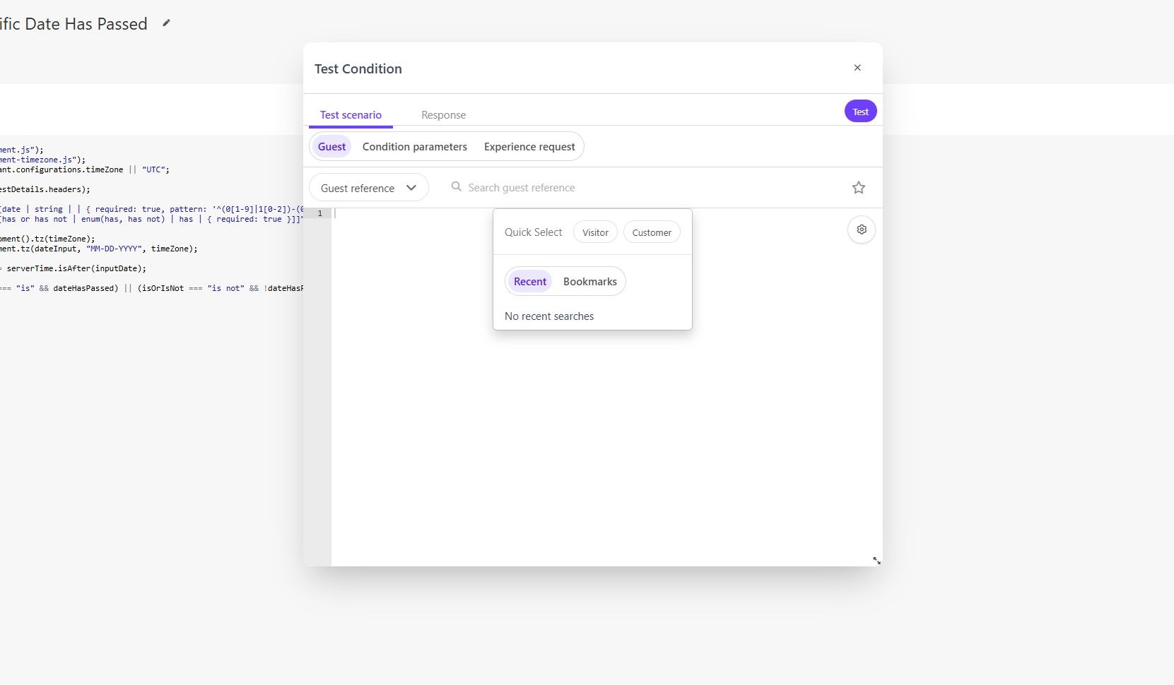 const or let—these don't work in any JavaScript written for the Personalize/CDP platform.print('whatever'); instead of console.log for outputting data. This is the only supported method for debugging output, which I'll explain in more detail shortly.When creating a Condition in Personalize, you can test the output of your condition and various input combinations during development. Navigate to your condition and click the Test option to display a floating panel. The first option lets you select a guest profile for testing. This feature is valuable because you can choose guests who should either match or not match your condition's criteria, allowing you to verify both positive and negative test cases.
